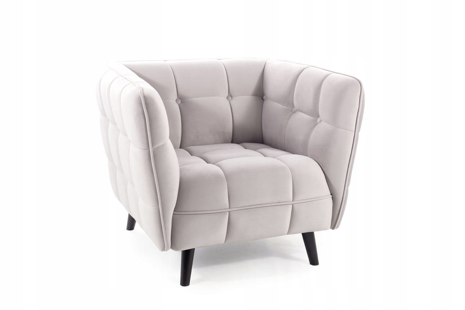 Fotel Castello o niebanalnym kształcie jest nie tylko designerski, ale również niezwykle wygodny. Miękkie siedzisko i wysokie podłokietniki zadbają o komfort i relaks. Stylowe pikowania zakończone guzikami w kolorze tkaniny zwiększają poczucie estetyki i zdobią mebel. Szary kolor z łatwością dopasuje się do niemal każdej aranżacji. Wysokie, drewniane nóżki nadają całości lekkości, a dodatkowo ułatwiają sprzątanie pod meblami.