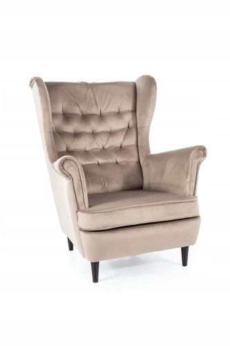 Fotel Harry Velvet to bardzo efektowny projekt od producenta Signal. Przede wszystkim fotel zwraca uwagę swoimi rozmiarami oraz unikalną estetyką, która charakterystyczna jest dla uszaków. Mebel stworzono z myślą o codziennym wykorzystywaniu go w takich miejscach jak domowe salony i biblioteczki. Z powodzeniem może być również częścią wyposażenia pokoju hotelowego, gabinetu, czy też innych miejsc biznesowych. Klasyczny styl mebla dobrze sprawdza się w stonowanych i zdobionych wnętrzach, jednak z powodzeniem może być on wykorzystywany również w nowoczesnych aranżacjach. Podstawa fotela powstała z drewna w kolorze wenge. Od ramy odchodzą cztery proste nogi. Forma mebla oraz siedzisko to elementy tapicerowane, które obszyto aksamitną tkaniną. Na oparciu znajduje się pikowany wzór. Ponadto fotel ma wysokie oparcie oraz klasyczne podłokietniki, które wpływają na komfort jego użytkowania. Mebel dostępny jest w kilku wariantach kolorystycznych.