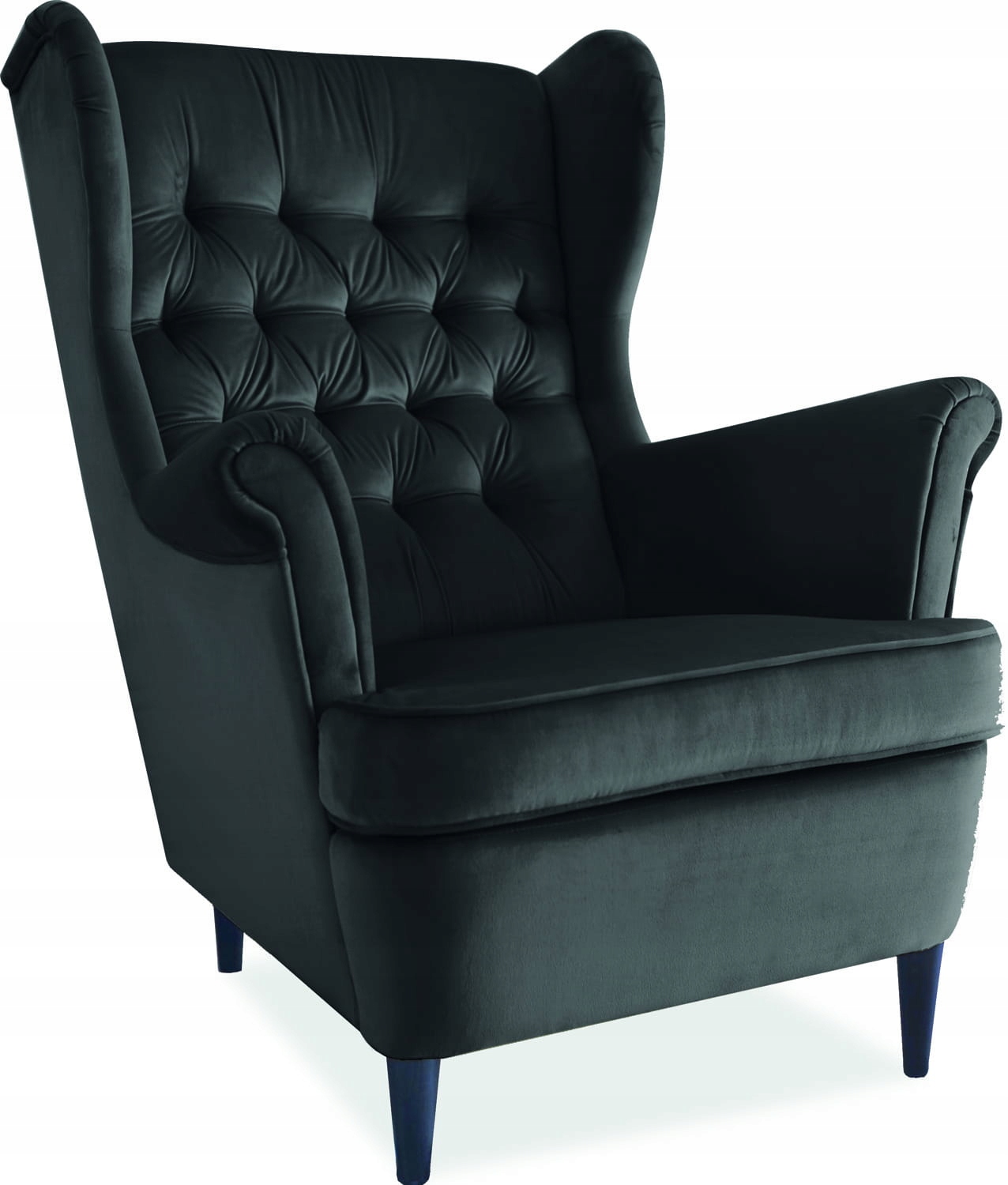 Fotel uszak Harry Velvet to bardzo oryginalny mebel, który powstał na bazie klasycznego projektu. Mebel ten zwraca uwagę swoimi rozmiarami oraz kształtem, dzięki czemu bardzo szybko może stać się kluczowym elementem aranżacji. Fotel dobrze wpisze się w klasyczne i bogato zdobione wnętrza. Z powodzeniem można wykorzystywać go w domowych biblioteczkach lub salonach jako element kącika wypoczynkowego. Ponadto dobrze sprawdzi się również w stylizowanych biurach lub pokojach hotelowych. Główna forma mebla opiera się na drewnianej podstawie w kolorze wenge. Od siedziska odchodzą cztery, proste nogi. Tapicerowane elementy mebla pokryto czarną tkaniną, która w strukturze przypomina aksamit. Oparcie jest wysokie i posiada efektowny, pikowany wzór na froncie. Ponadto fotel ma grube siedzisko oraz wysokie podłokietniki, które dopełniają projekt. Mebel dostępny jest w kilku wariantach kolorystycznych. Produkt jest dostarczany do klienta w elementach i wymaga montażu.