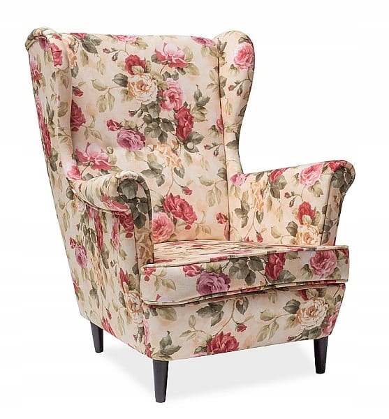 Fotel LORD to mebel pełen uroku oraz niepowtarzalnego wdzięku, który doskonale sprawdzi się w każdym rodzaju przestrzeni. Mebel poprzez swoje kształty, rodzaj obicia oraz kolorystykę sprawia, że pomieszczenie, w którym go umieszczamy staje się od razu znacznie bardziej przytulne. Mebel doskonale sprawdzi się w domowym salonie, sypialni, ale to również bardzo ciekawa propozycja dla stylowej kawiarni, czy restauracji. Fotel składa się z głębokiego siedziska oraz wysokiego oparcia z podłokietnikami. Jego duży rozmiar nie odbiera mu jednak lekkości, ponieważ fotel umieszczony został na czterech drewnianych nóżkach w kolorze ciemnego brązu. Całość pokryta została ciekawą tkaniną w liście oraz kwiaty. Fotel dostępny jest również w innej wersji kolorystycznej.