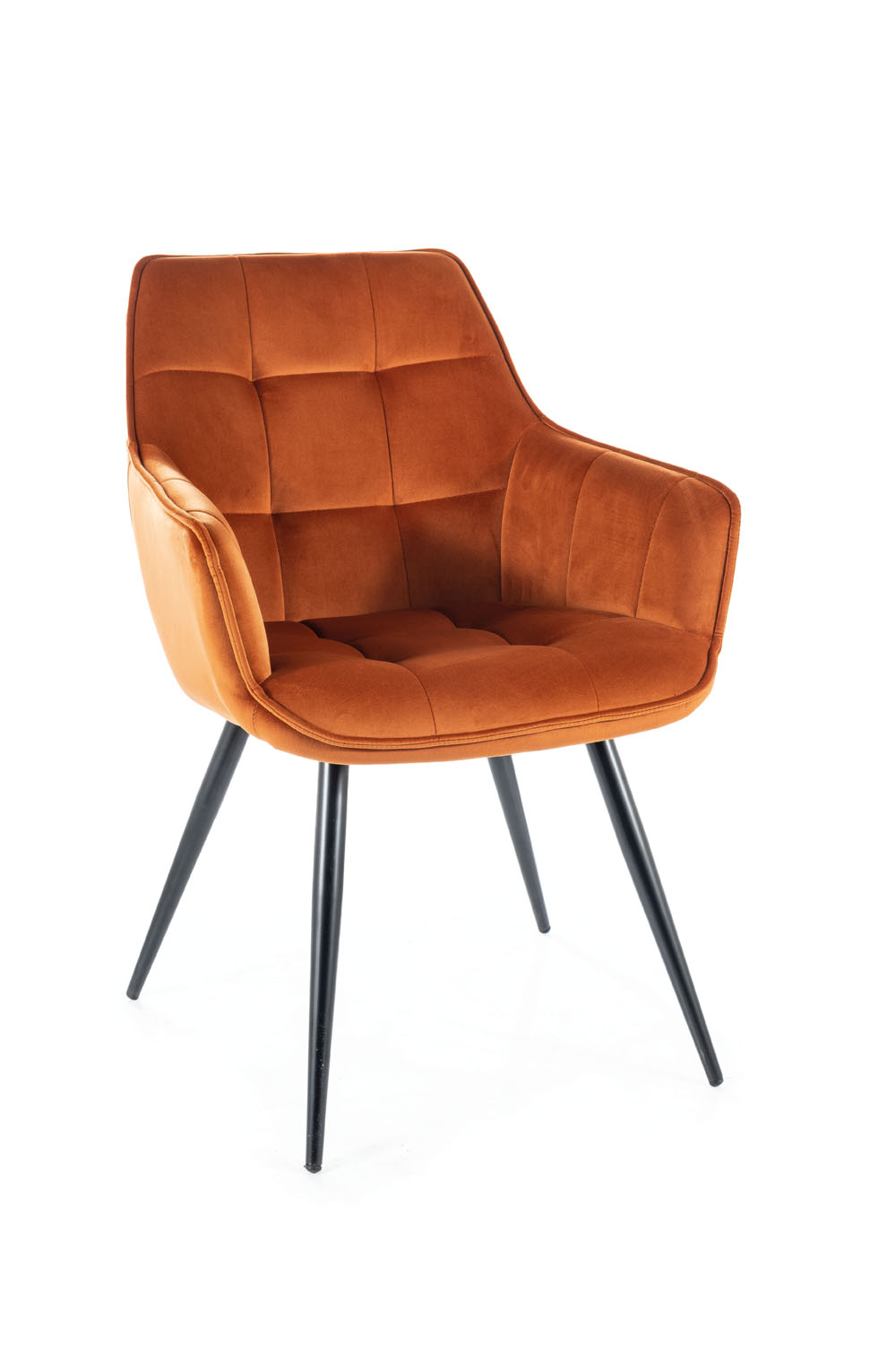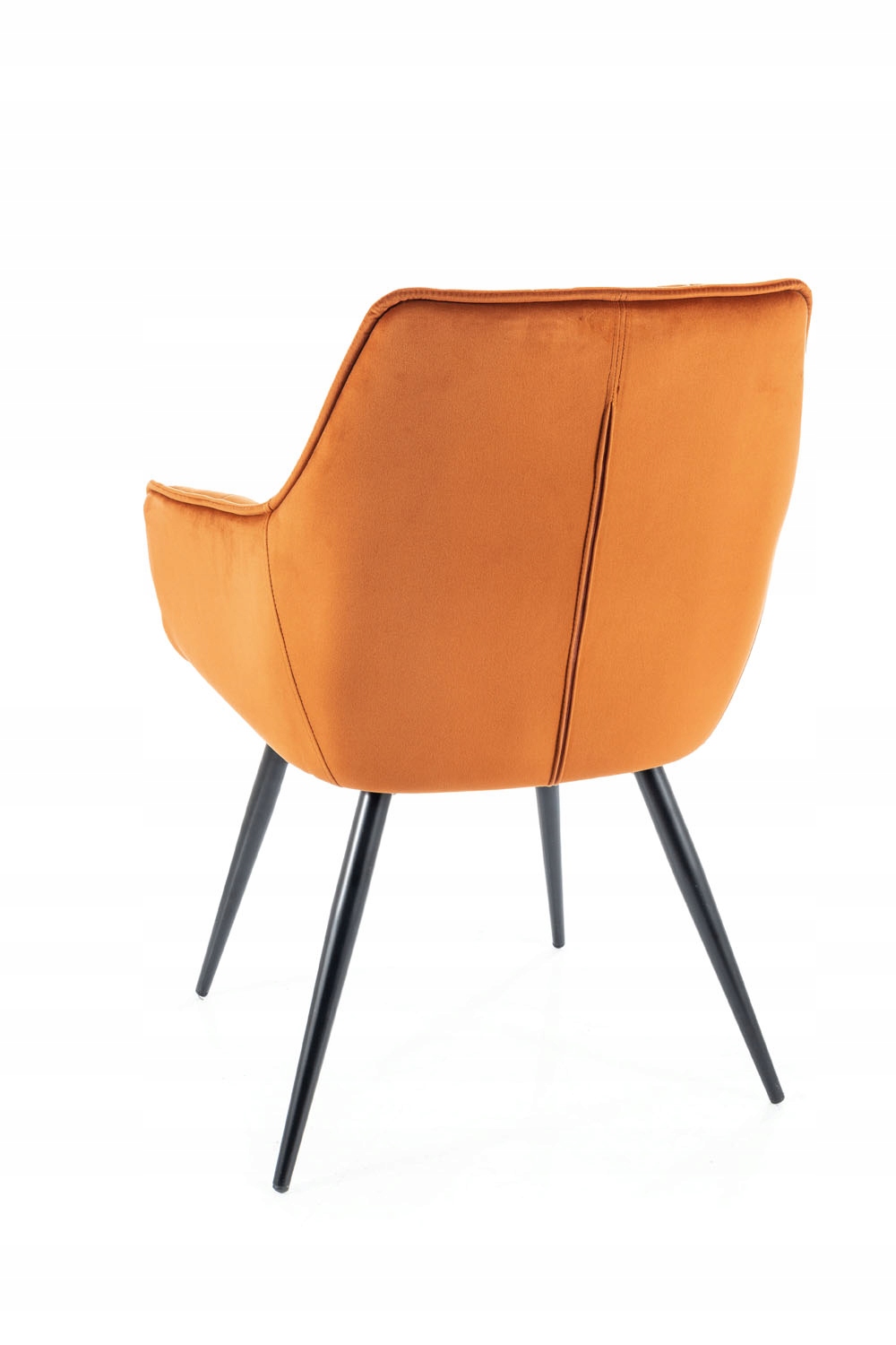 Stabilny, metalowy stelaż w kolorze czarnym idealnie dopasowuje się do aksamitnej tapicerki. Krzesło jest bardzo wygodne dzięki szerokiemu, miękkiemu siedzisku oraz podłokietnikami. Zapewnia komfort nawet podczas długiego użytkowania.