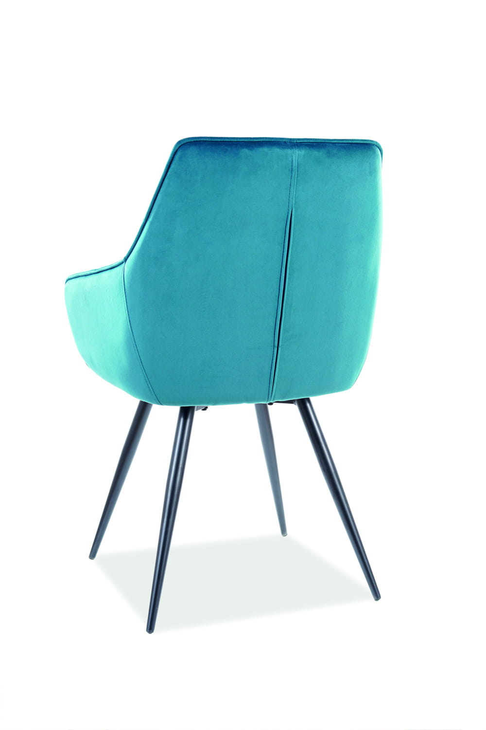 Stabilny, metalowy stelaż w kolorze czarnym idealnie dopasowuje się do aksamitnej tapicerki. Krzesło jest bardzo wygodne dzięki szerokiemu, miękkiemu siedzisku oraz podłokietnikami. Zapewnia komfort nawet podczas długiego użytkowania.