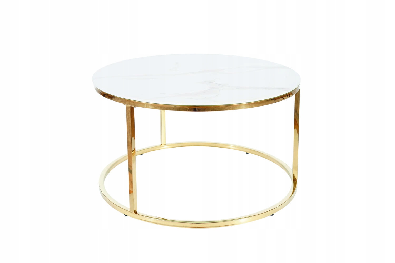 Okrągła, designerska ława do salonu i pokoju dziennego stanie się kluczowym elementem wystroju dzięki idealnemu doborowi kolorów i estetyce wykonania. Ława Sabine zachwyca pięknym białym blatem z efektem marmuru, co w połączeniu ze złotym stelażem tworzy zachwycający i niebanalny mebel.