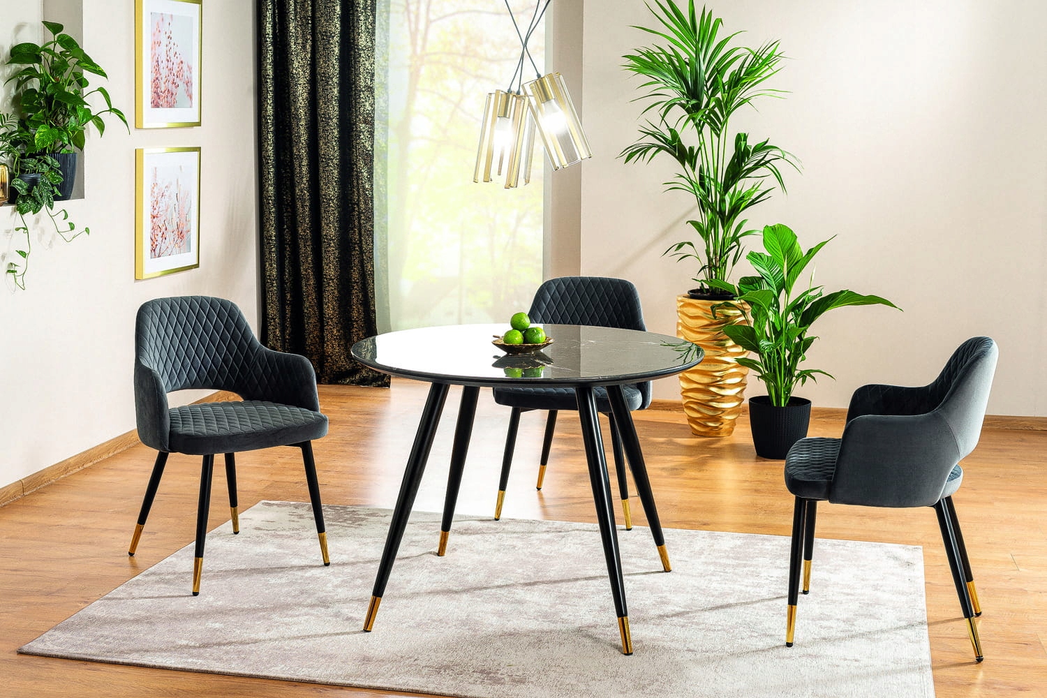 Elegancki i pełny wyjątkowego uroku stół Cyryl II do salonu i jadalni. Stół idealnie dopasuje się do nowoczesnych aranżacji i stylu glamour. Okrągły blat zapewni wygodę wszystkim domownikom, a duża przestrzeń między nogami pozwoli wsunąć krzesła i zachować estetyczny porządek we wnętrzu.