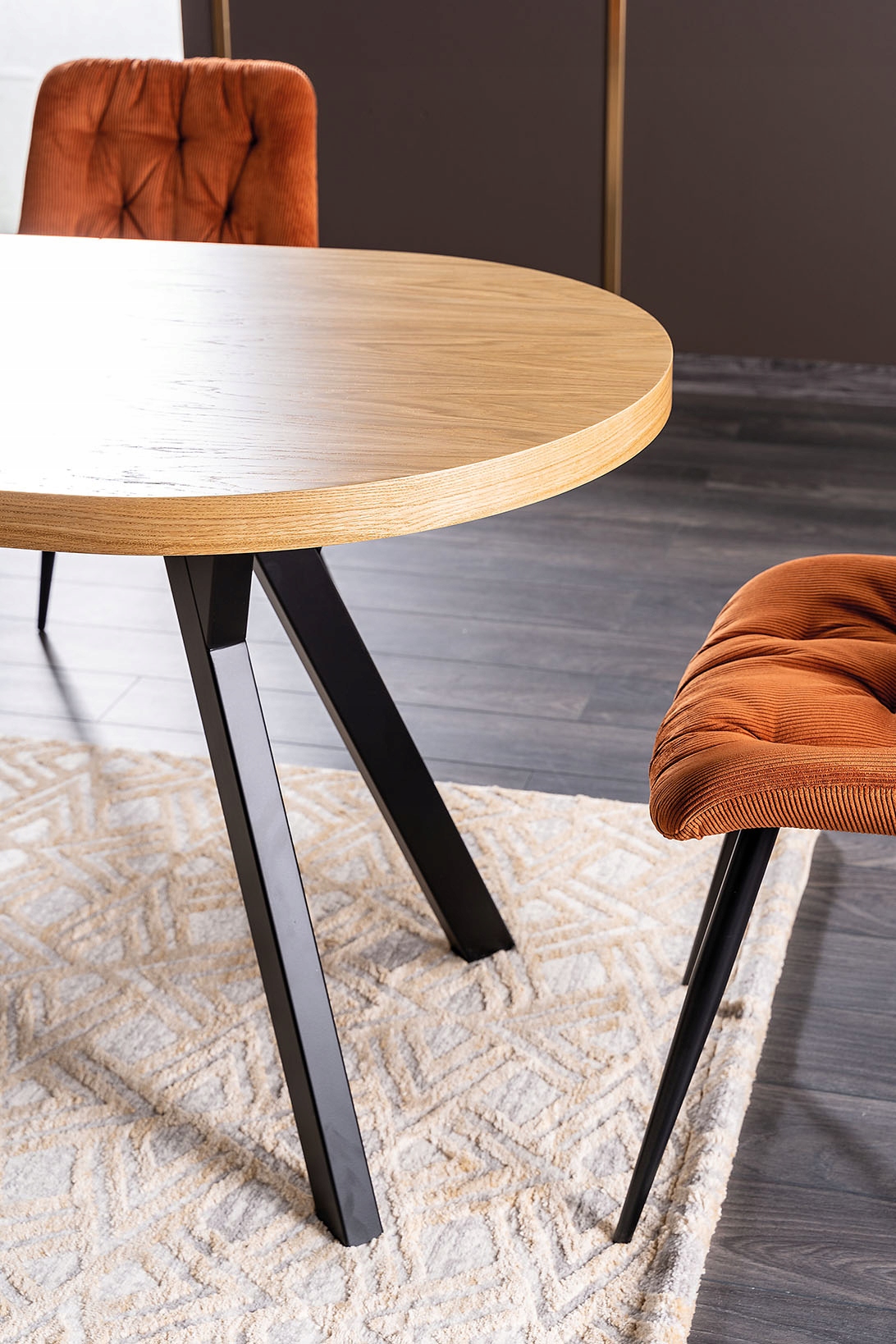 Blat stołu pokryty jest naturalną okleiną dębową, która świetnie prezentuje się w niemal każdej aranżacji. Naturalny wygląd drewna wprowadza do wnętrza poczucie ciepła i stylowy wygląd wnętrza. Wraz z czarnym, metalowym stelażem zapewnią dopasowanie do nowoczesnego oraz loftowego designu pomieszczenia.