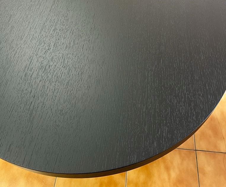 Blat stołu pokryty jest naturalną okleiną dębową malowaną na czarny mat, która świetnie prezentuje się w niemal każdej aranżacji. Naturalny wygląd drewna wprowadza do wnętrza poczucie ciepła i stylowy wygląd wnętrza. Wraz z czarnym, metalowym stelażem zapewnią dopasowanie do nowoczesnego oraz loftowego designu pomieszczenia.